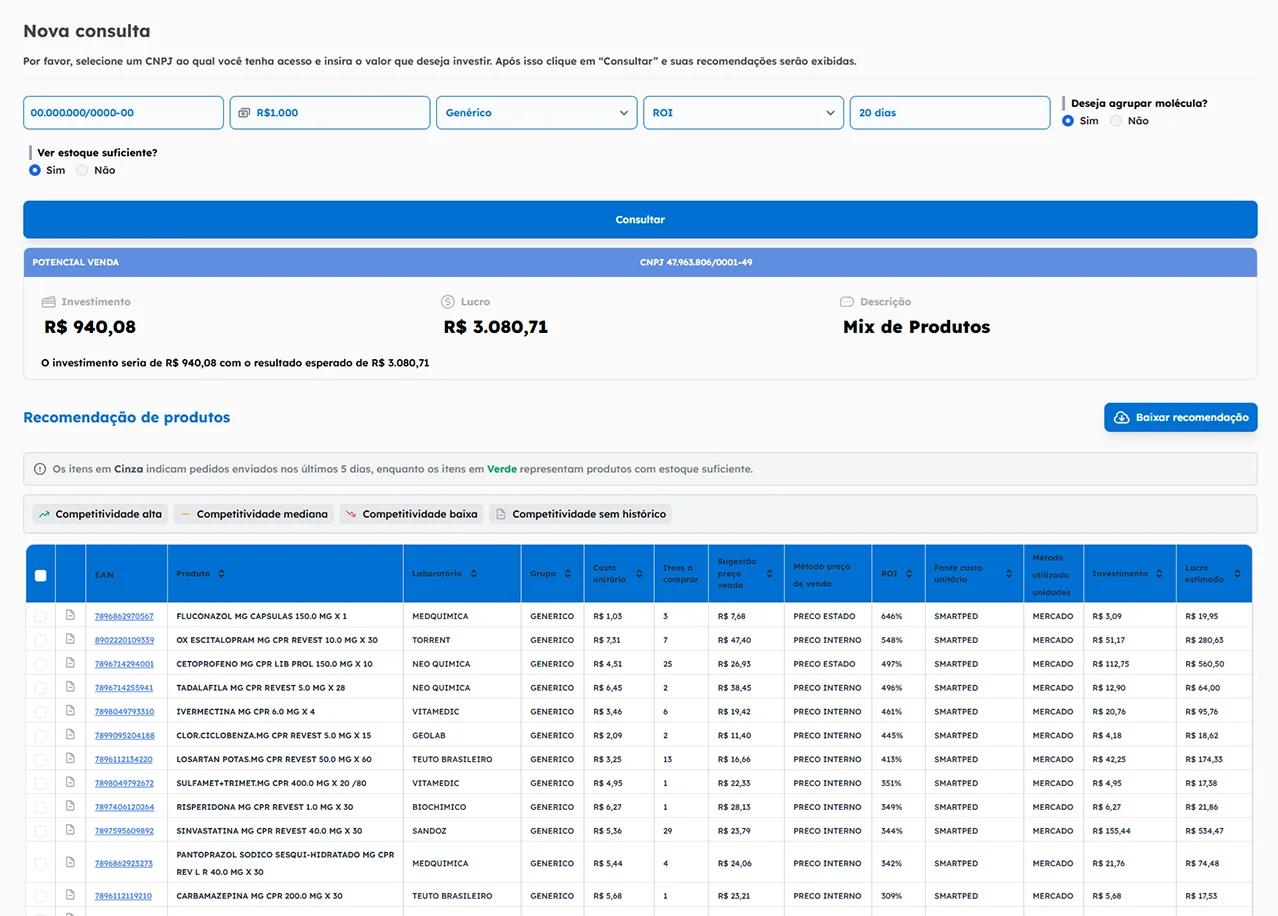 O Otimiza usa inteliência de dados para transdormar a gestão de compras da sua farmácia. Ele analisa o histórico de vendas, o mix de produtos e o estoque atual da loja, cruzando essas informações com: